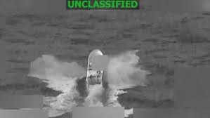 Un video difundido por el Comando Sur estadounidense muestra una lancha en movimiento antes de ser alcanzada por un impacto. En las imágenes, captadas en blanco y negro, se observa un destello seguido de una explosión. El material presenta partes del encuadre oscurecidas y subtítulos integrados, elementos que forman parte del archivo original.