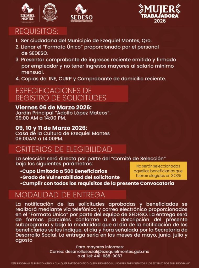 Por segundo año consecutivo, el Gobierno Municipal de Ezequiel Montes, encabezado por el presidente municipal Iván Reséndiz Ramírez, puso en marcha el programa Mujer Trabajadora, iniciativa orientada a respaldar a mujeres en situación vulnerable del municipio.